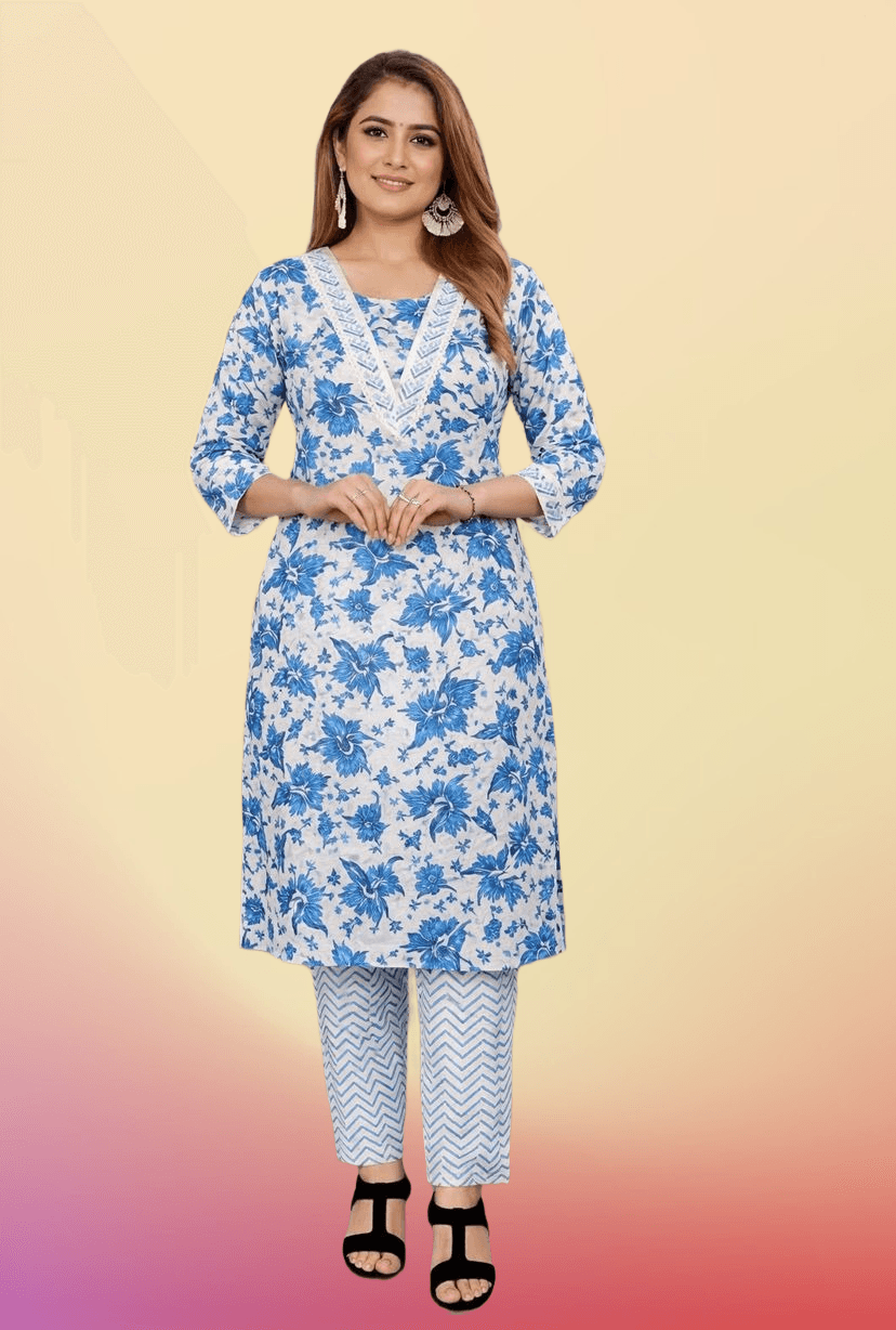Cotton Kurti Pant Set with Designer Pakistani Neck