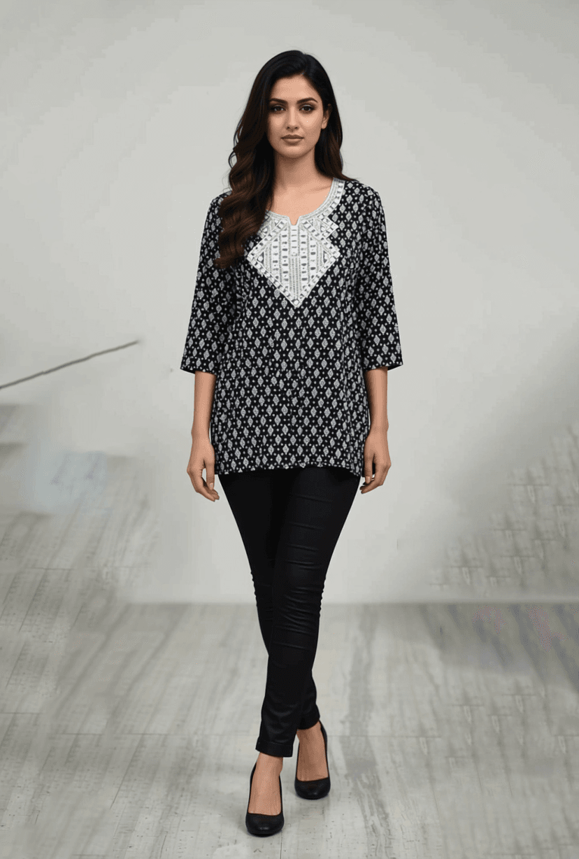 Add a dash of contemporary charm to your ethnic wardrobe with this chic women’s kurti. Featuring a modern cut and a comfortable fit, this kurti is perfect for pairing with jeans, palazzos, or skirts. Crafted from soft, breathable fabric, it offers all-day comfort with stylish appeal. Whether you’re heading to college, work, or a casual outing, this short kurti brings effortless elegance to your everyday look.