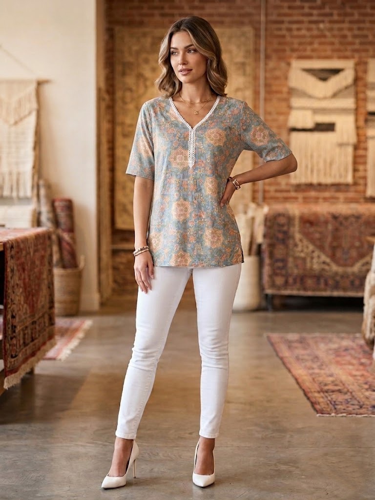 Add a dash of contemporary charm to your ethnic wardrobe with this chic women’s kurti. Featuring a modern cut and a comfortable fit, this kurti is perfect for pairing with jeans, palazzos, or skirts. Crafted from soft, breathable fabric, it offers all-day comfort with stylish appeal. Whether you’re heading to college, work, or a casual outing, this short kurti brings effortless elegance to your everyday look.