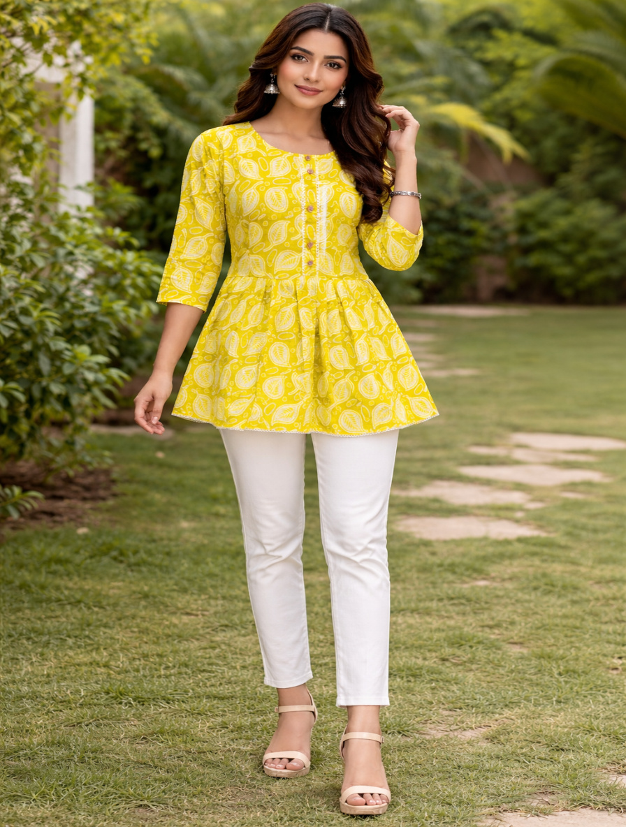 Add a dash of contemporary charm to your ethnic wardrobe with this chic women’s kurti. Featuring a modern cut and a comfortable fit, this kurti is perfect for pairing with jeans, palazzos, or skirts. Crafted from soft, breathable fabric, it offers all-day comfort with stylish appeal. Whether you’re heading to college, work, or a casual outing, this short kurti brings effortless elegance to your everyday look.